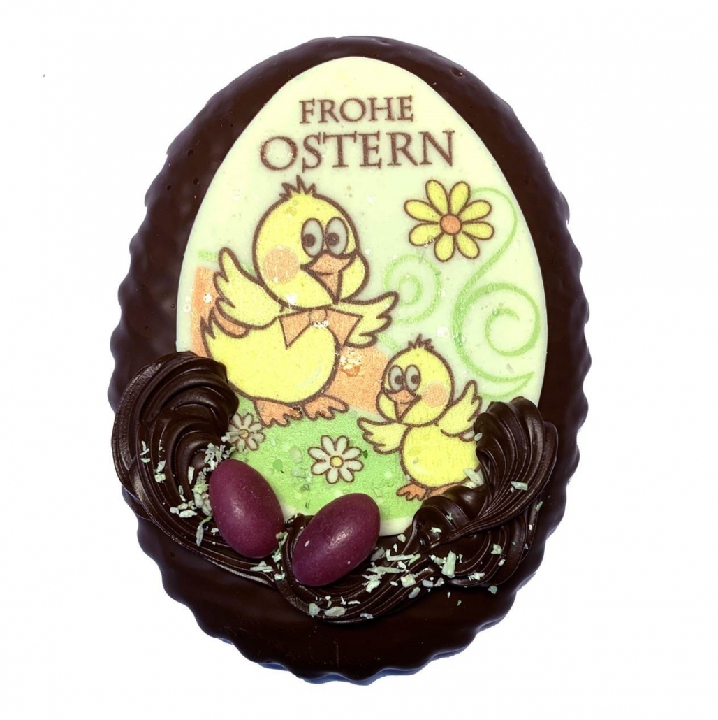 Ausseer Lebkuchen Osterei. Feinster Lebkuchen mit Marzipanplatte (diverse Ostermotive) und Zartbitter Schokolade überzogen. Handgefertigt.